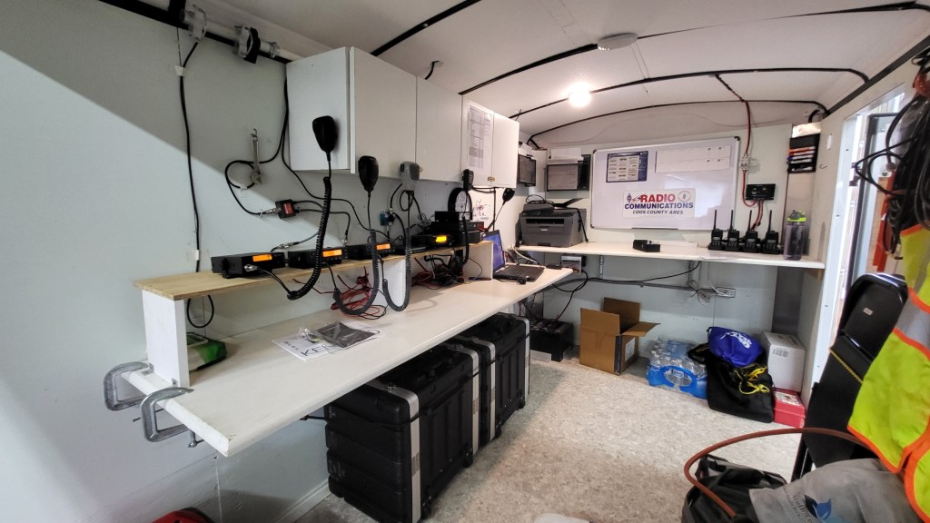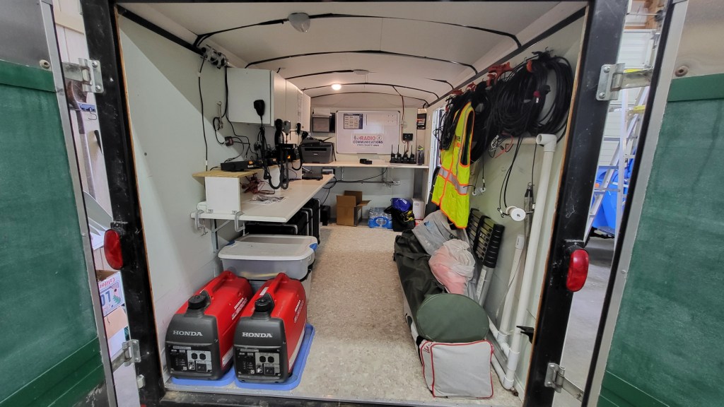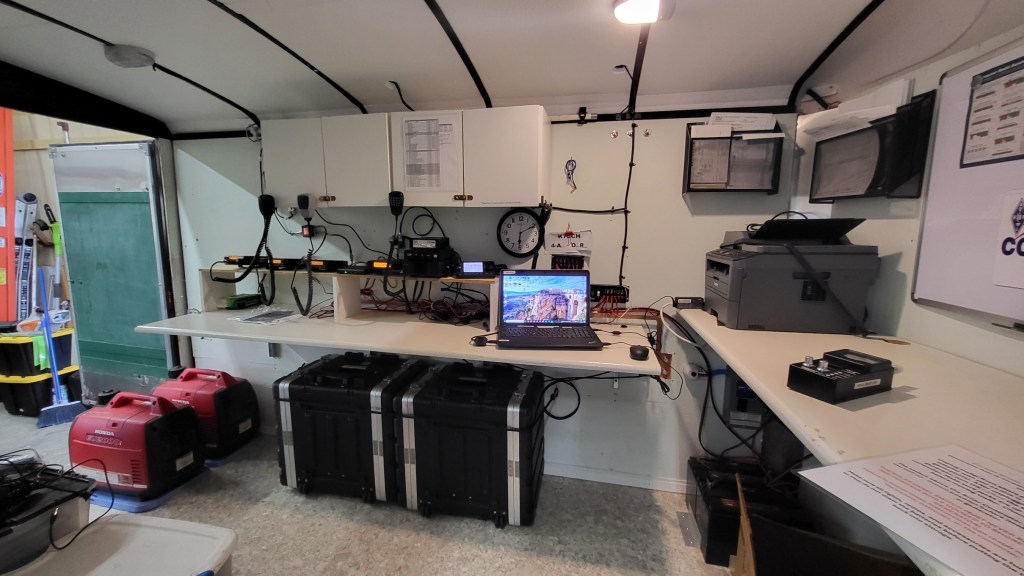 The small yet very capable unit consists of multiple radio and antenna combinations that allow communications near or far. Public service radios allow for direct contact with county and state agencies while Amateur Radios connect with other ARES or EMCOMM groups to pass emergency traffic. We also have the capability for Marine, CB, and GMRS/FRS bands.